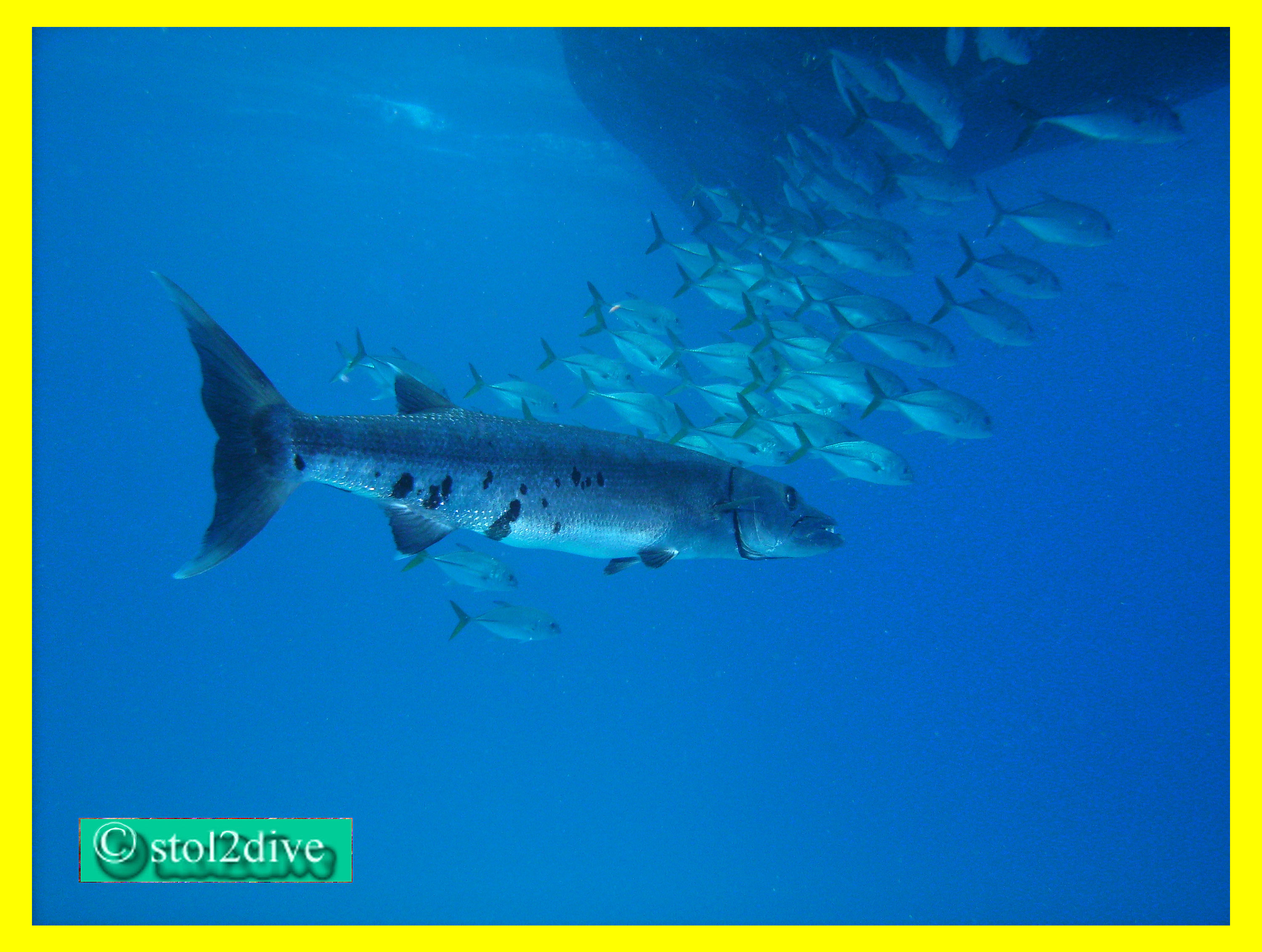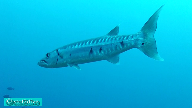 The barracuda (sphyraena barracuda) is a large carnivorous marine fish of the Sphyrenidae family. It is a coastal species of warm seas, common in the Caribbean, Florida and the Bahamas; it roams in open water between the surface and a depth of 30 m and it is very recognizable with its more or less numerous black spots on a fusiform body which can reach 2 m in length for a weight of 50 kg. Its dorsal part is generally green, gray or dark blue, its sides are silvery and its belly is withish. Its dorsal and anal fins are placed symmetrically on the rear part of the body. They can be yellow or of a dark shade. Its head sports a mouth with a prominent lower jaw and sharp teeth. Its morphology makes it an excellent swimmer capable of lightning strikes. It can make short bursts of speed over 40 km/h.