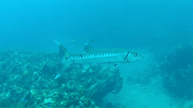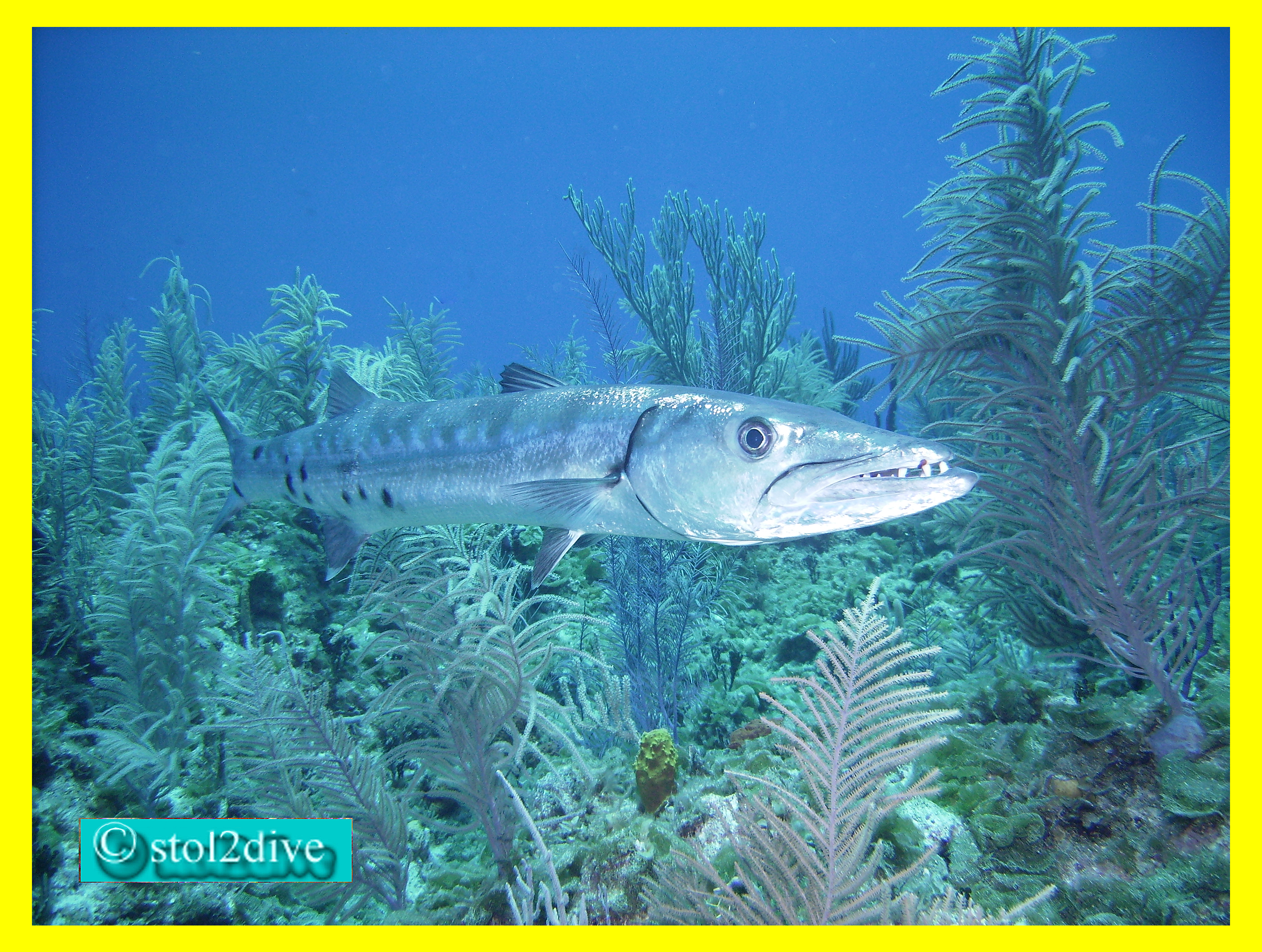 Le barracuda (sphyraena barracuda) est un grand poisson marin carnassier de la famille des Sphyrénidés. Espèce côtière de mers chaudes, commune aux Caraïbes, à la Floride et aux Bahamas, il se rencontre en pleine eau entre la surface et 30 m et il est très reconnaissable avec ses tâches noires plus ou moins nombreuses sur un corps fusiforme pouvant atteindre 2 m de longueur pour un poids de 50 kg. La partie dorsale est généralement verte, grise ou bleu foncé, les flancs argentés et le ventre blanchâtre. Les nageoires dorsales et anales sont placées symétriquement sur la partie arrière du corps. Elles peuvent être jaunes ou d'une teinte sombre. La tête est équipée d'une gueule à la mâchoire inférieure proéminente et aux dents acérées. Sa morphologie en fait un excellent nageur capable d'attaques foudroyantes. Il peut effectuer de brèves pointes de vitesse à plus de 40 km/h.