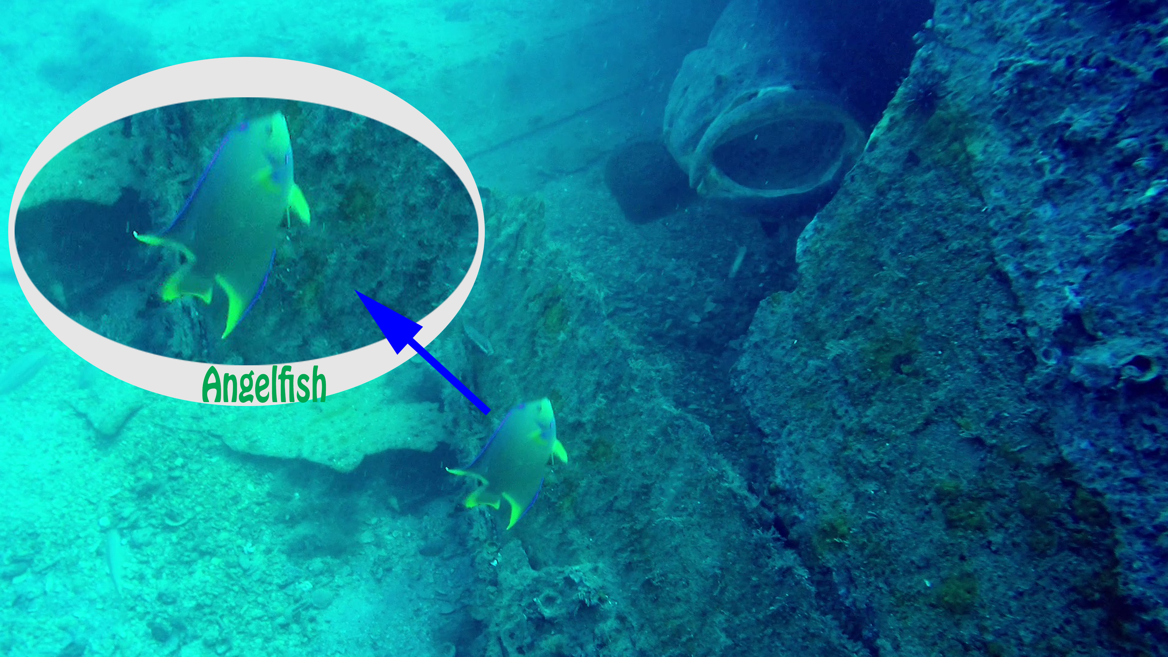 In a previous video, you were able to compare the size of a goliath grouper with that of an adult diver. On this new video shot in July 2019 on the "Fin barge" wreck, you can compare the size of the mouth of a goliath grouper with the length of an adult angel fish, which is between 30 and 45 cm.