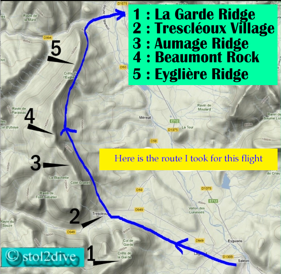 Here is the aerial route I followed on the morning of April 5, 2011 with my ULM MCR to fly over the Beaumont Rock to the Southwest of Tallard (LFNA), a mountain range surrounded by magnificent ridges.